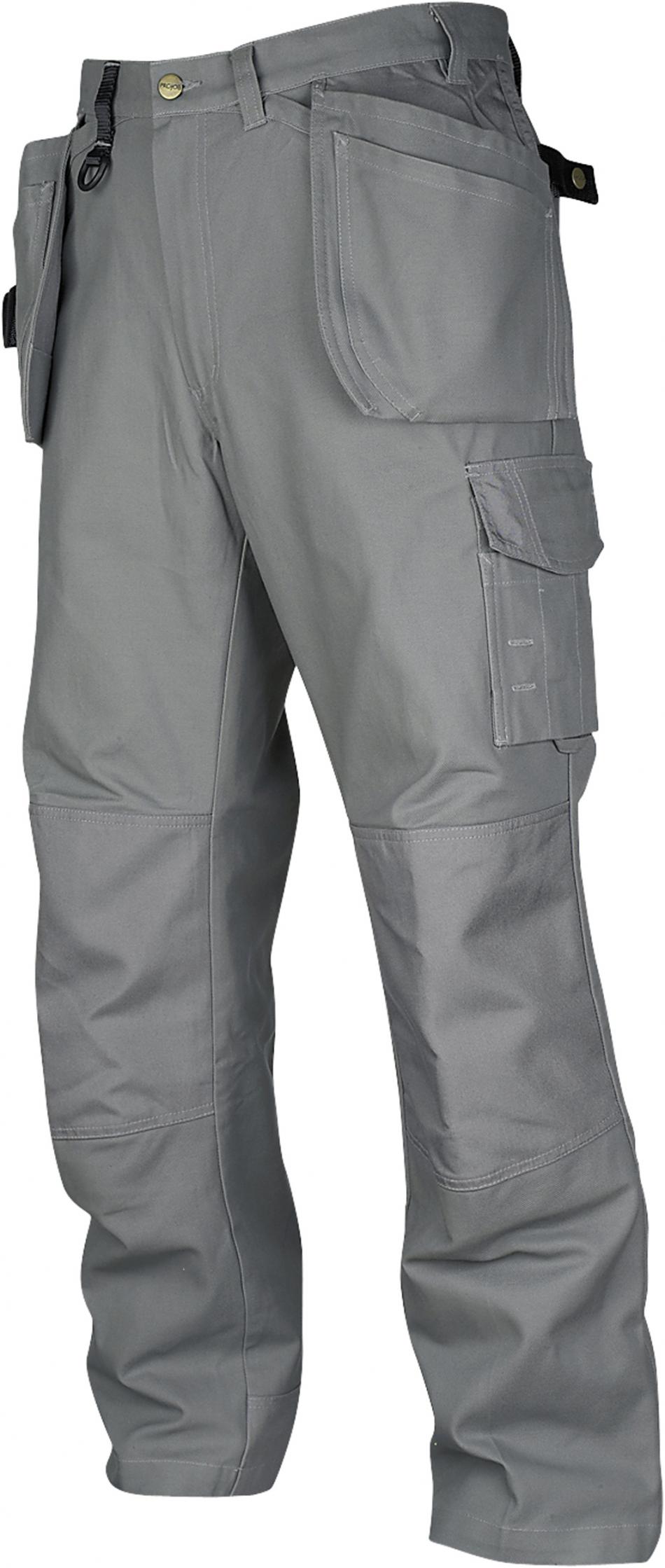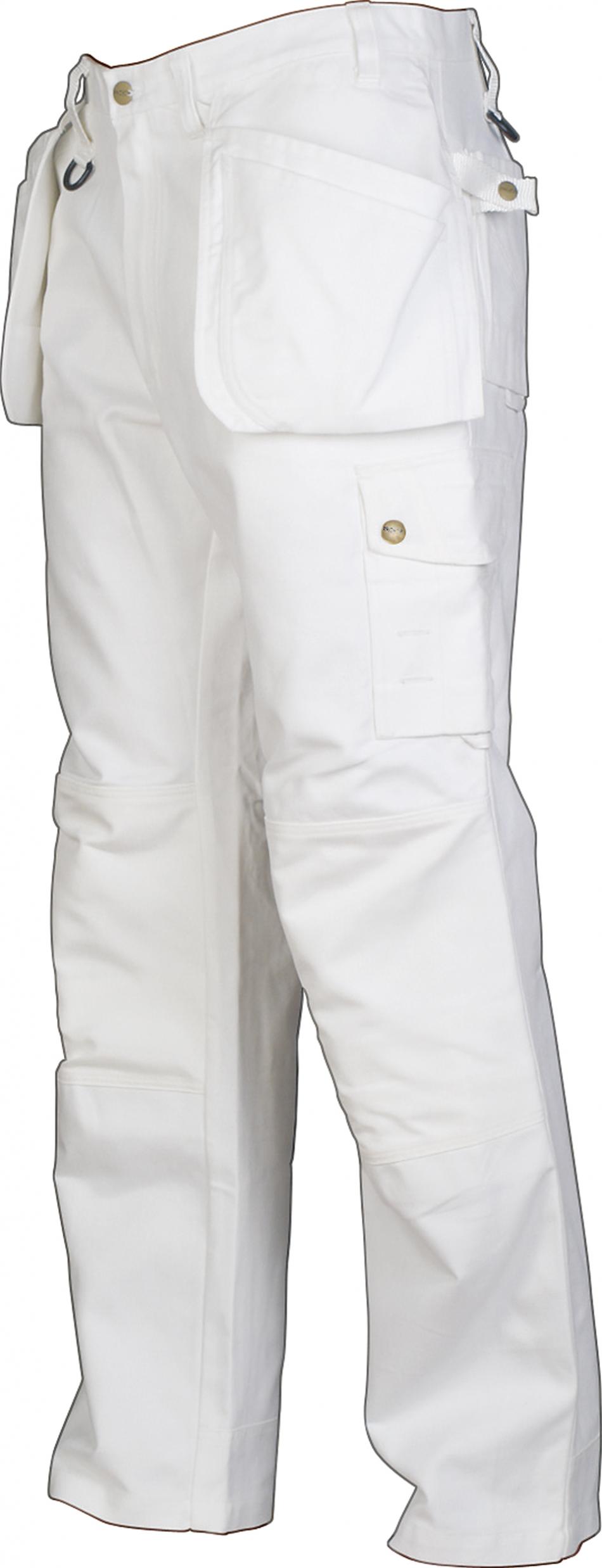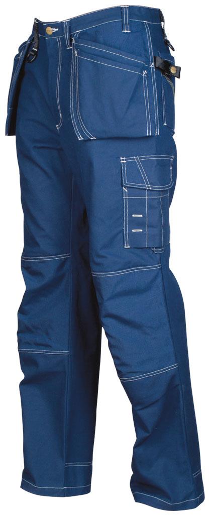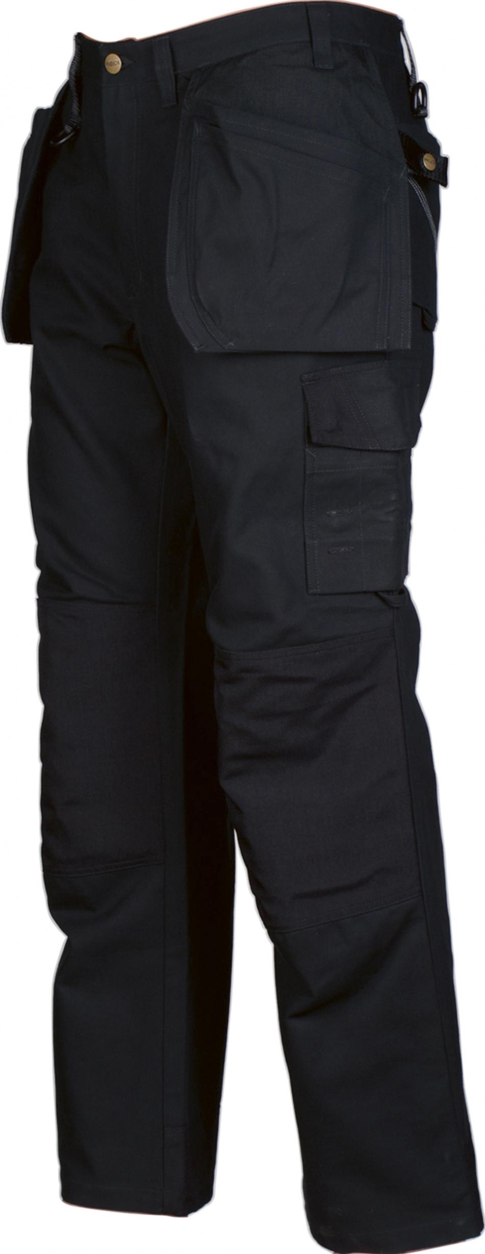 100 % Cordura®. Benfickor med telefonficka, pennficka och verktygsficka. Två reglerbara hammarhankar. Två D-ringar. Tumstocksficka med verktygsficka och knivknapp. Knäskyddsfickor i Cordura®, öppning inifrån och reglerbar höjd av knäskydden. Förböjda knän. Förstärkt längst ner på baksidan av benen med Cordura. Bakfickor med övervidd. Bakfickor och benfickor har hällor för Inbags.