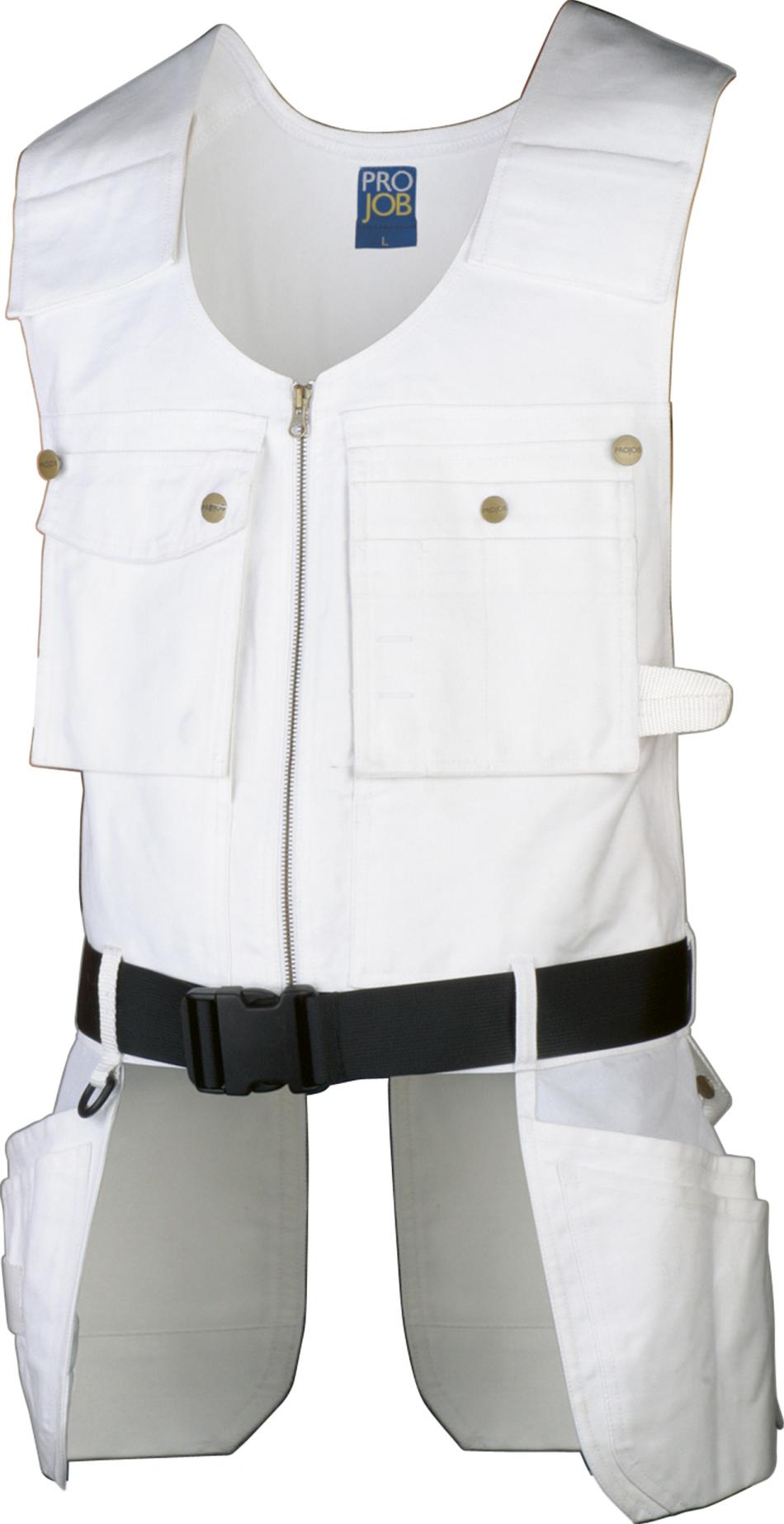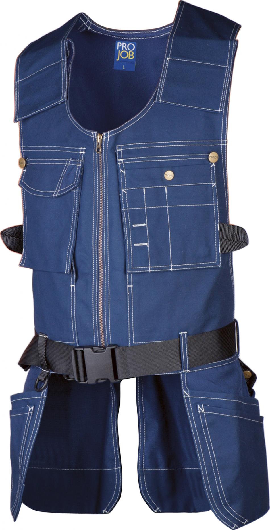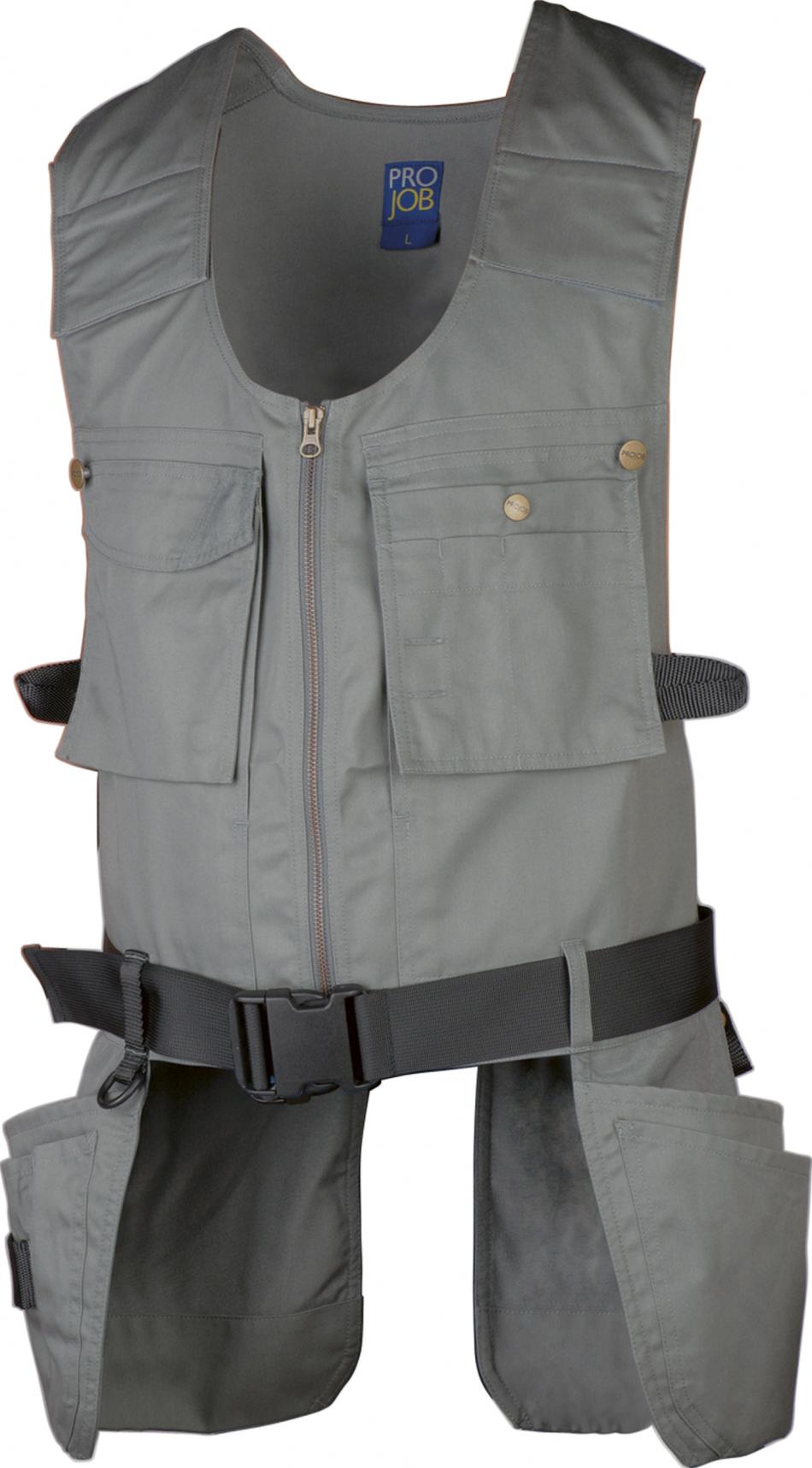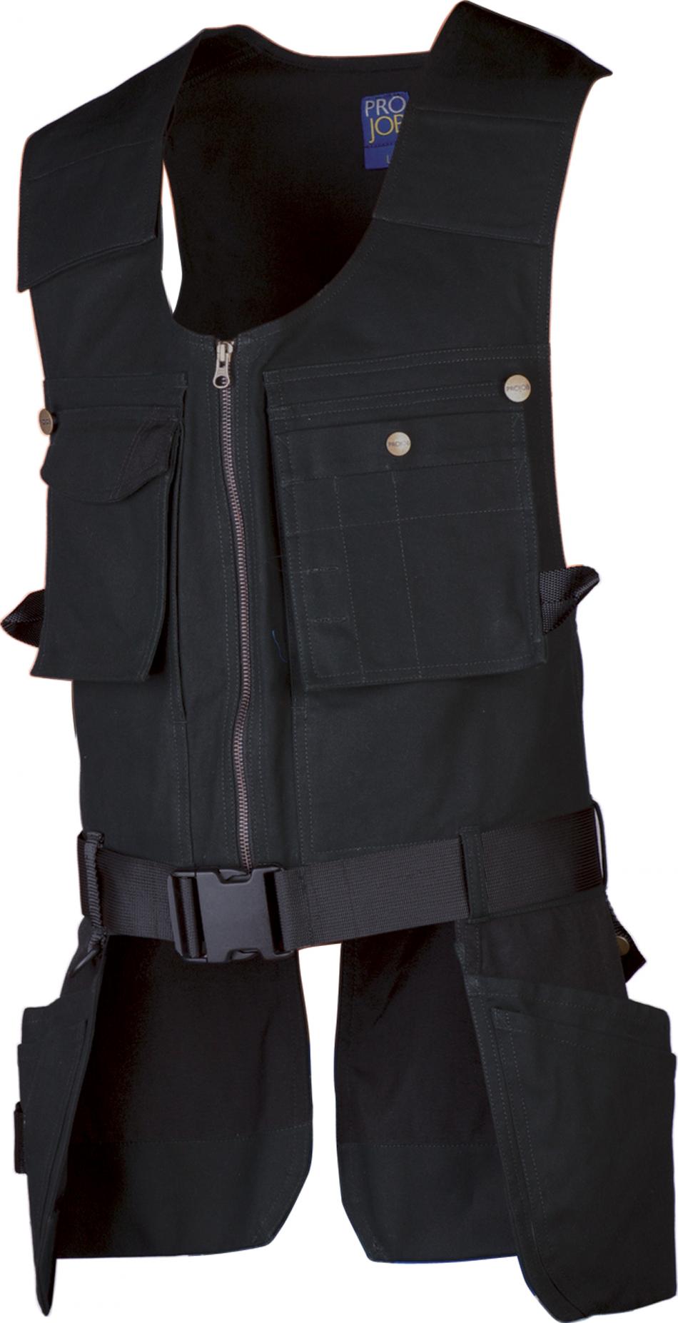 Bälte med reglerbart spänne som gör att västen sitter på plats vilket ger mindre belastning. Tvåvägsdragkedja fram. Två D-ringar. Breda axelband som regleras steglöst med kardborrelås. Två löst hängande bröstfickor med pennfack och verktygsfack, som kan knäppas fast. Dolda innerfickor för handskar eller dokument. Knapp och hälla för kniv på vardera sida. Fyra löst hängande spikfickor. Spikfickorna fram har extra fickor, varav en med verktygshällor. Spikfickor förstärkta med 100 % Cordura®. Två reglerbara hammarhankar.
