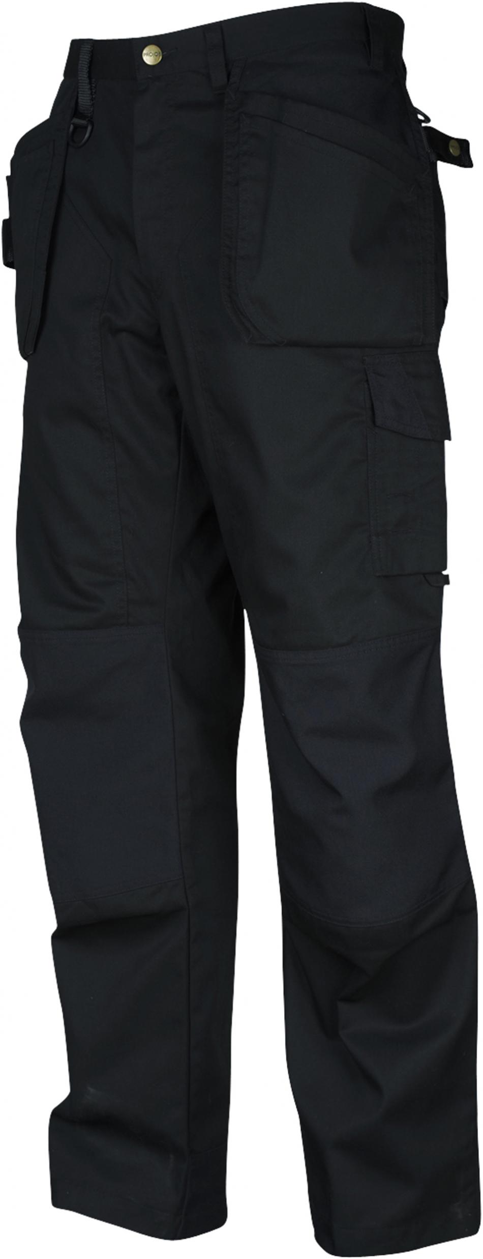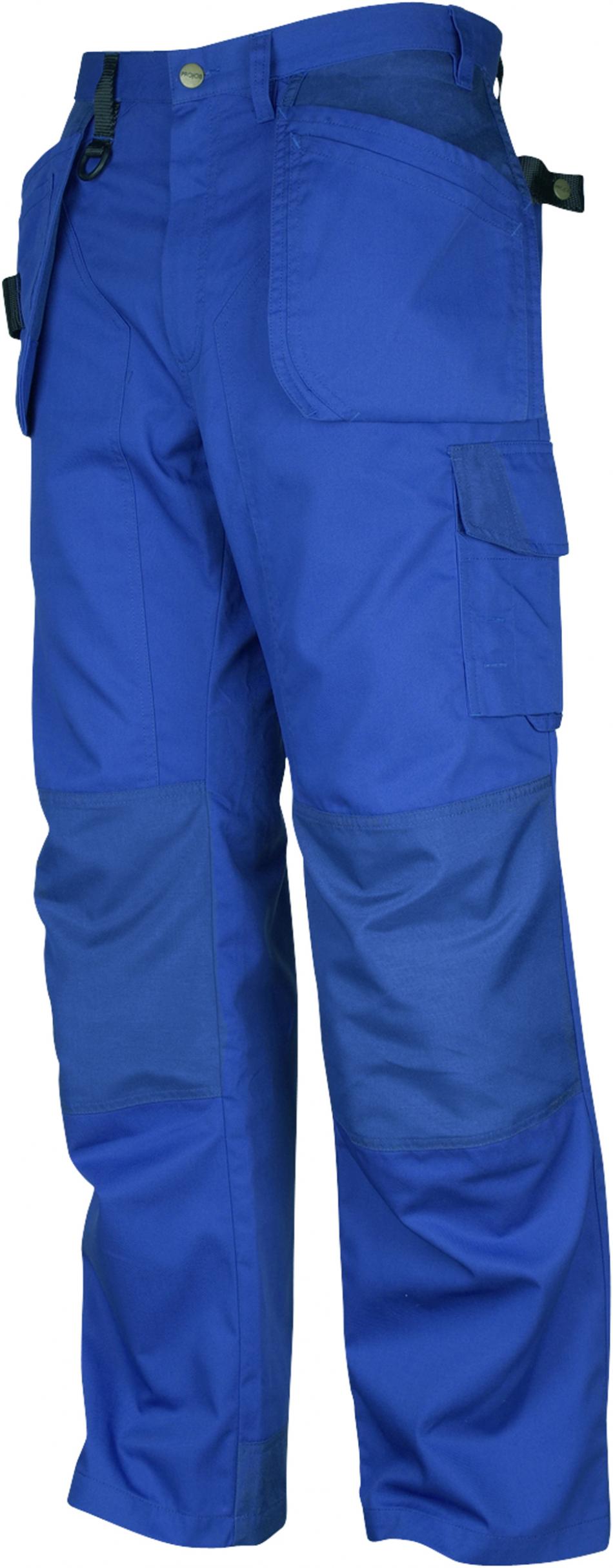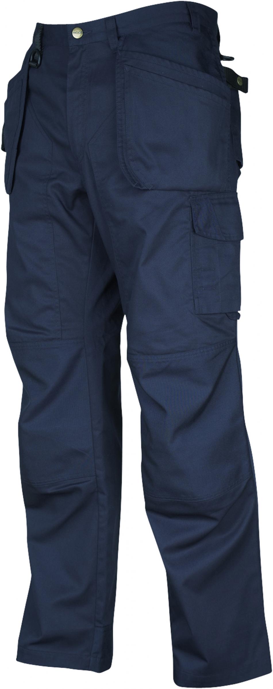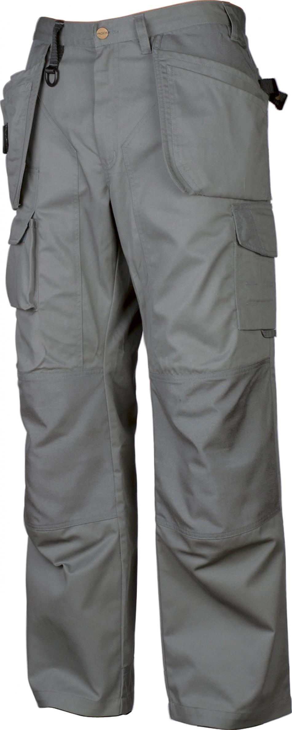 Två hängande, undanstoppningsbara spikfickor; en med extra fickor och en med verktygshällor. Spikfickorna är förstärkta med 100% Cordura®. Djupa sidfickor med plats för hängfickorna. Extra förstärkt på lår med dubbelt tyg. Benficka med telefonficka, pennficka och verktygsficka. Två reglerbara hammarhankar. Två D-ringar. Tumstocksficka med verktygsficka och knivknapp. Knäfickor i Cordura® med öppning inifrån och reglerbar höjd av knäskydden. Förböjda knän. Förstärkt längst ner på baksidan av benen med Cordura®. Bakfickor med övervidd. Bakfickor och benfickor har hällor för Inbags.
