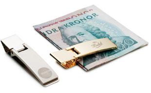 Praktisk sedelklämma i mattborstad silver eller guld med blanka detaljer. Moderiktig design och en populär present att ge bort. OBS! Märkes endast med gravyr.